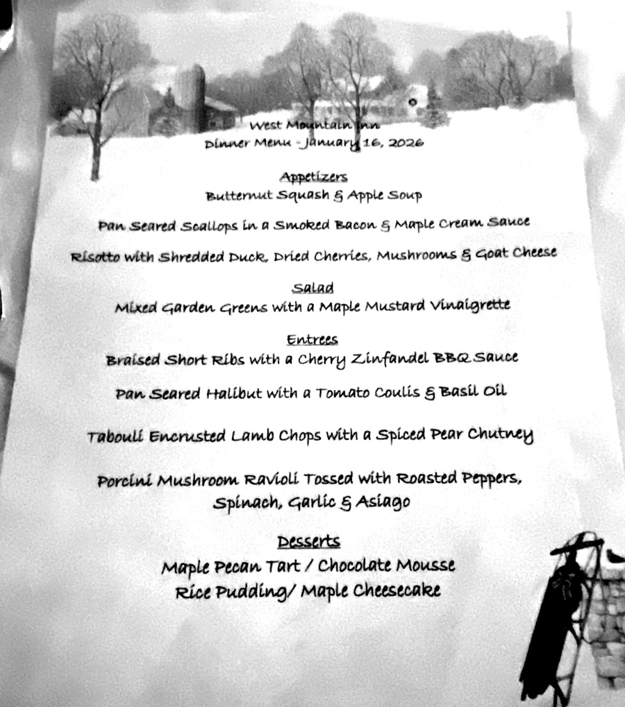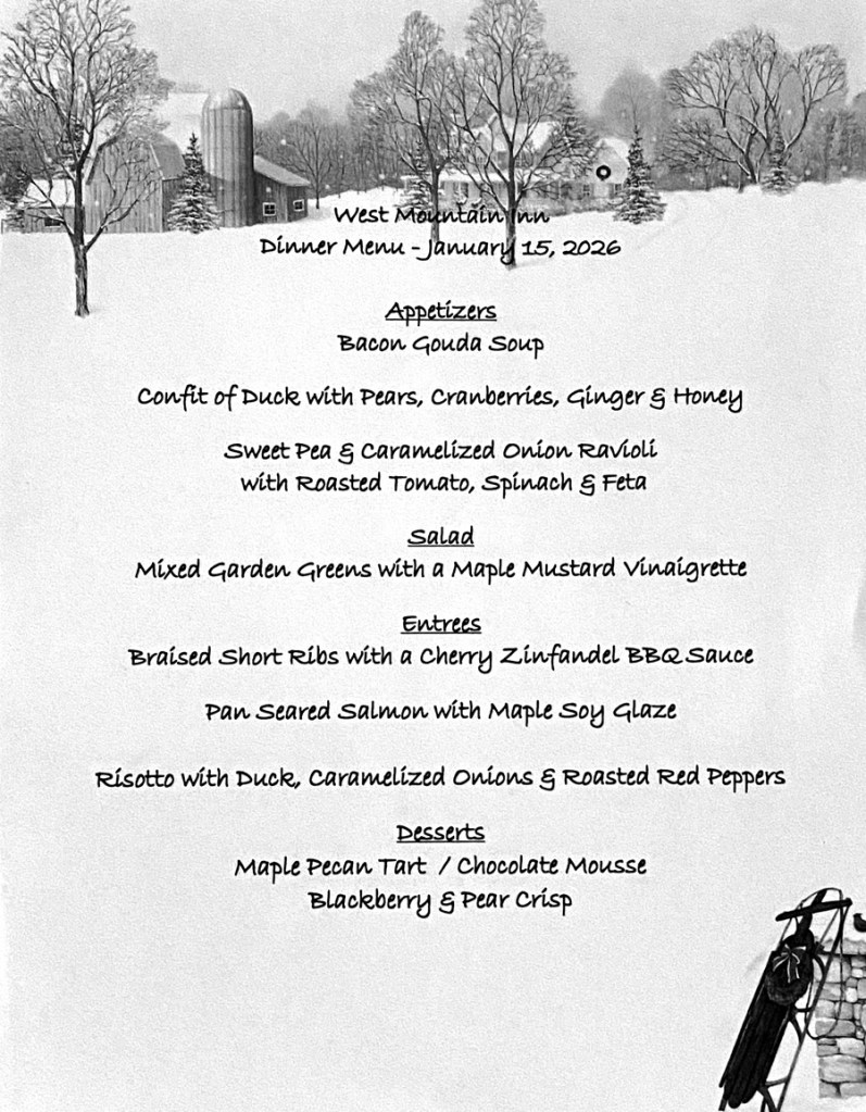 HAPPY NEW YEAR — I “do not do” New Year’s resolutions, but I have promised myself to get out and about more in 2026 than I did in 2025, and then document for my memory and to share with you – particularly things you may enjoy experiencing as I have. This tale is about a place I discovered during the Manchester, VT “Inn to Inn” tour in December 2023, and then again visited in December 2024, but never got to sharing – until now. THE WEST MOUNTAIN INN in Arlington, Vermont.