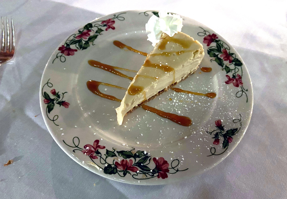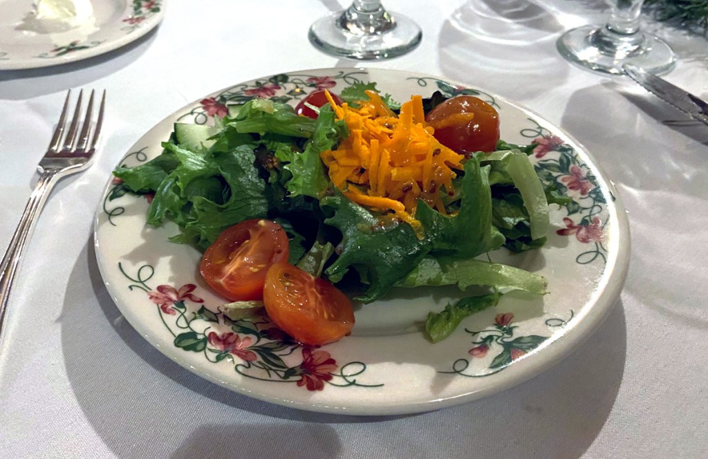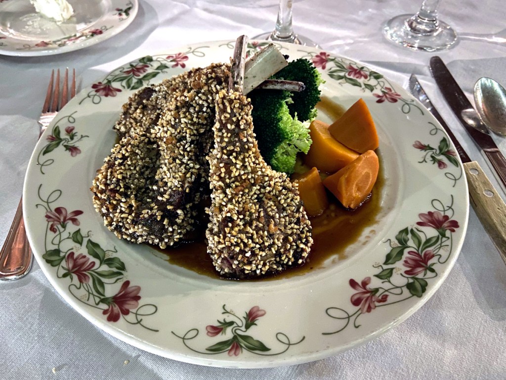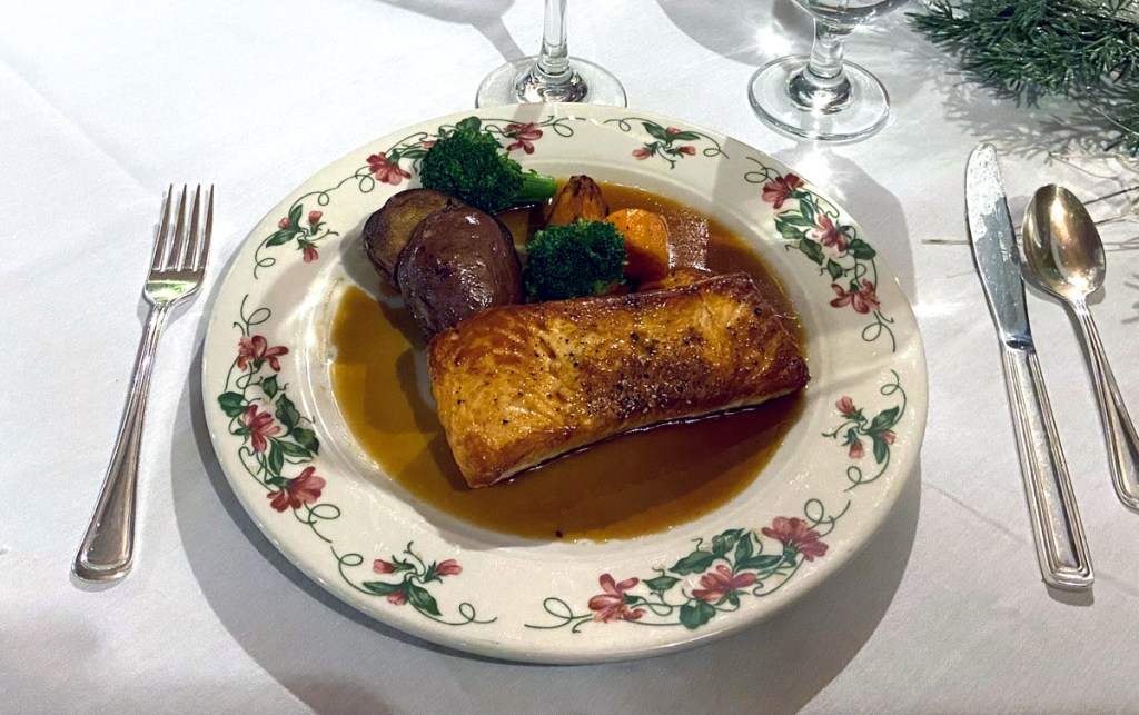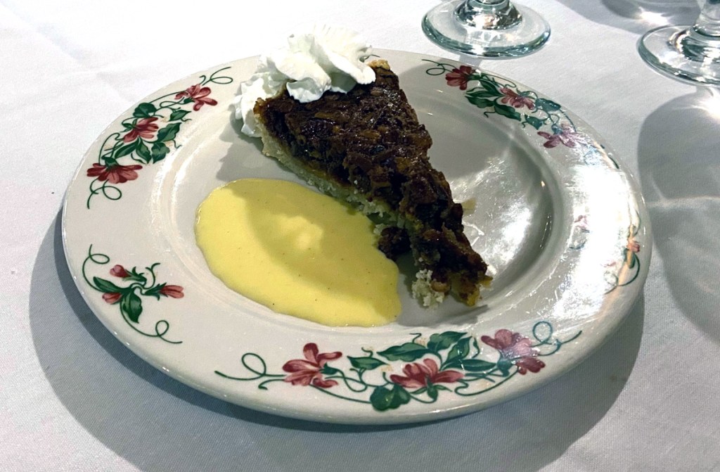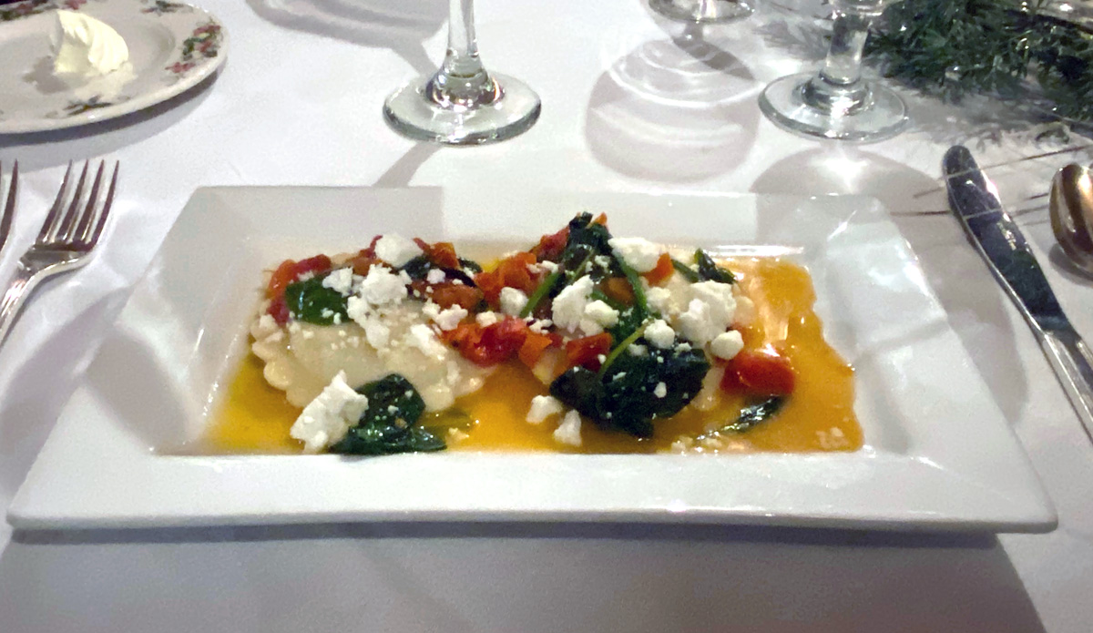 A real plus for staying here is a full dining room. Four course dinner – price fixed menu – $54 plus tax and tip – and amazing presentation and taste as you can see below for my first evening’s dinner of the Ravioli appetizer, salad, Salmon, and Maple Pecan tart.