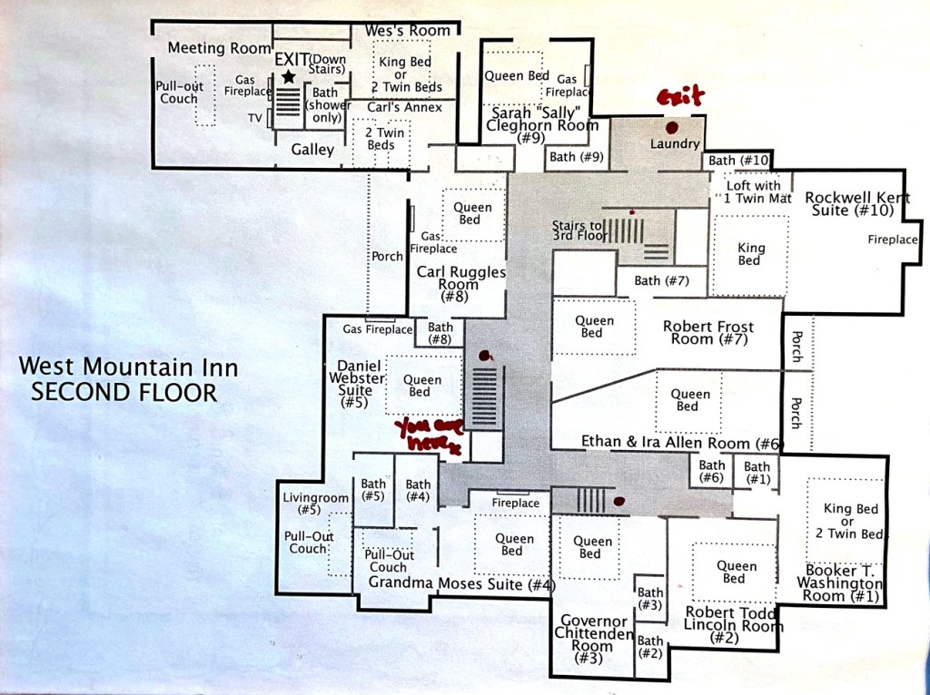 Getting ready to leave I saw the emergency exit map on the wall and had to take a picture to remember the layout of the various rooms. You can see my suite in the lower left, but the “living room” and “bedroom” had been switched furniture wise as has the Grandma Moses Suite. Did I say it was GREAT?