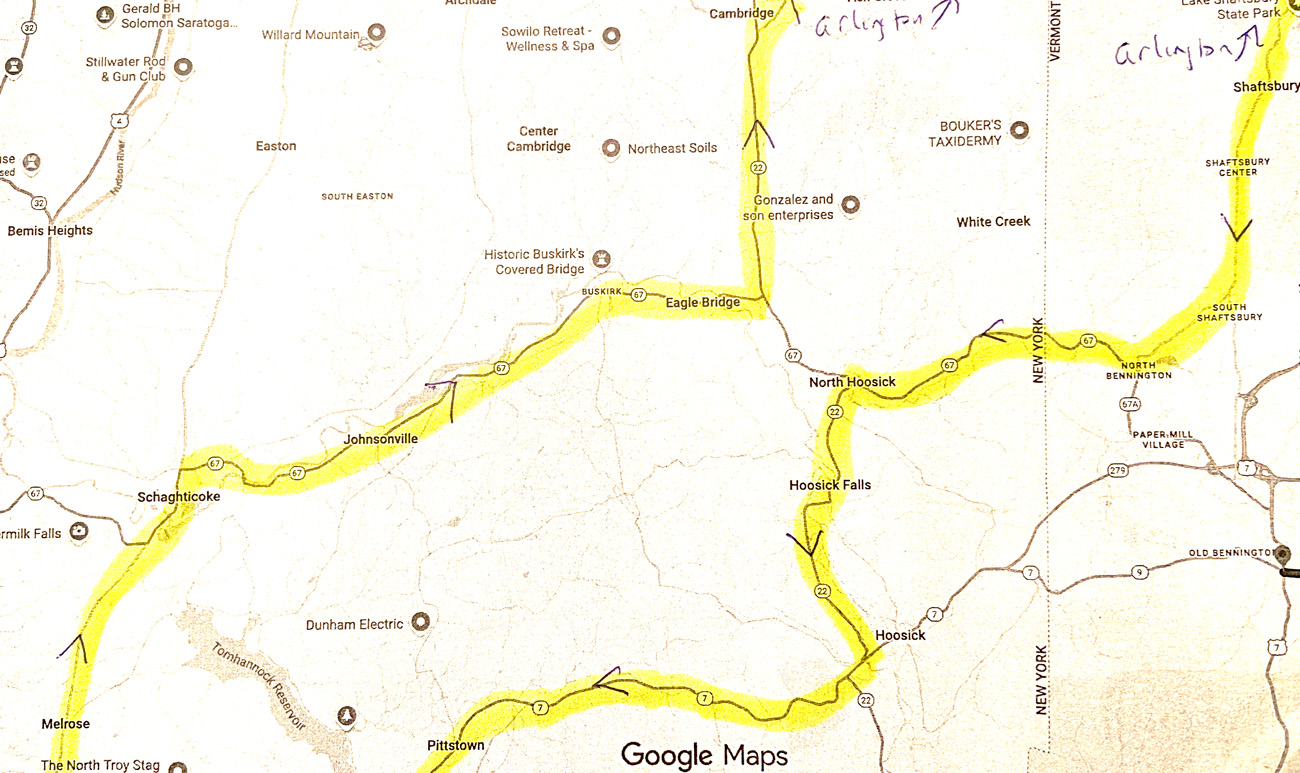 Friday – my full day in-between I planned an outing to some favorite back routes to explore and visit some antique shops (which are getting to be fewer and worse). Here is a rough map (sorry) of the circle route for my “day in between.” Starting in the top right in Arlington I headed south on 7A cutting over in North Bennington on 67 to North Hoosick, south through Hoosick Falls to Route 7 then west and cutting up to Melrose back to 67 to head east to NY22 to Cambridge, and then back to Arlington — trust you followed ! — But check it out. On the way I had to capture the old railroad control building in Johnsonville.
