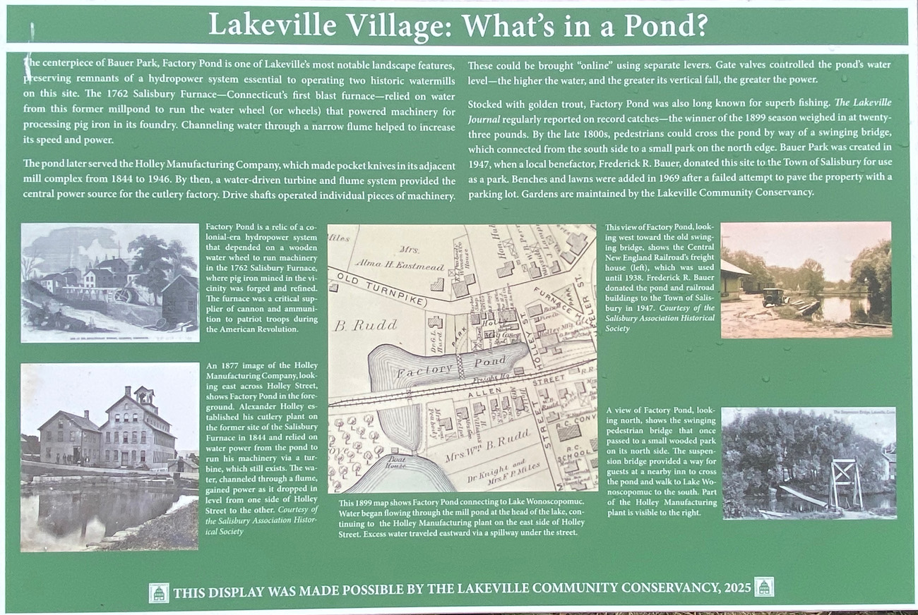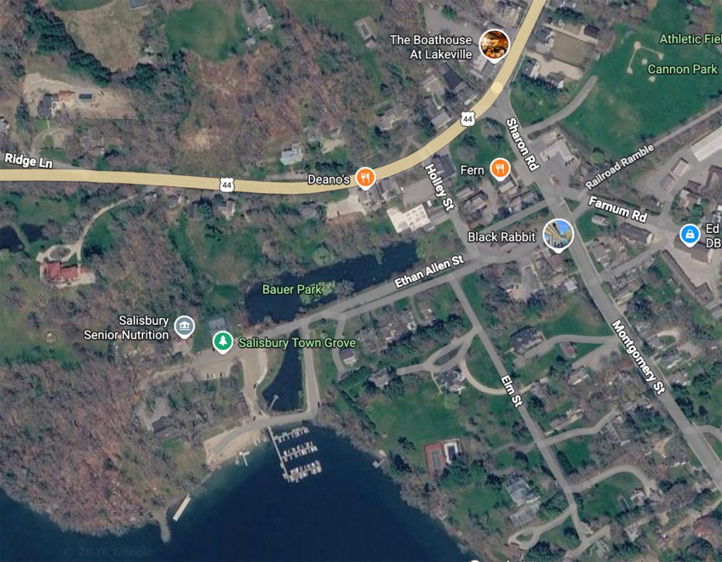 About 27 miles north of my former bookshop in New Preston, I really never grasped the full history of the area, including the railroad passing through from Millerton to Canaan, CT. This google view shows the pond feeding the Lakeville mills. The mills I show below are in the area above the “Black Rabbit” lettering. Also in this spot is the train station — I am having a hard time picturing it on the rise from the road to the east – stopping and starting at an incline? I need to learn more — the fun of coming home and reviewing my trips and learning more, and then needing to learn more.