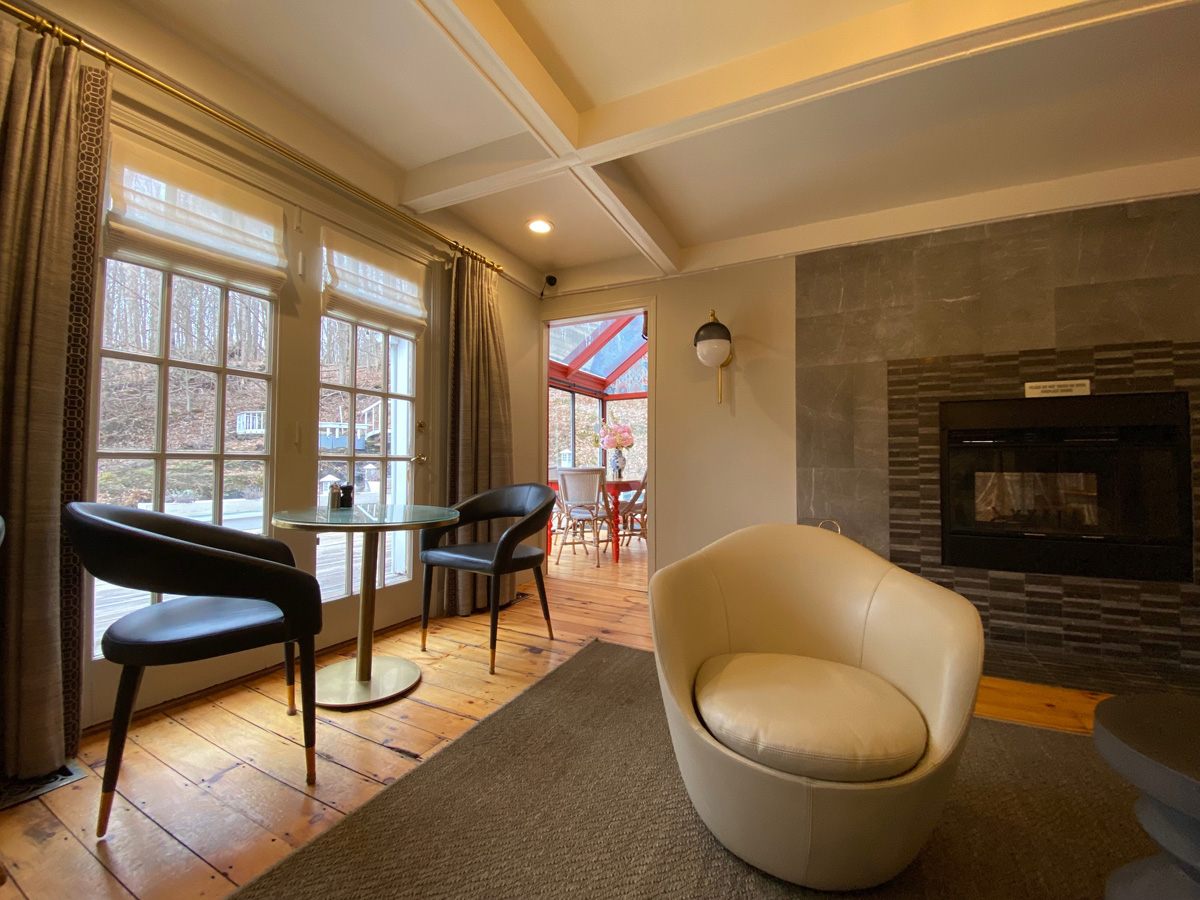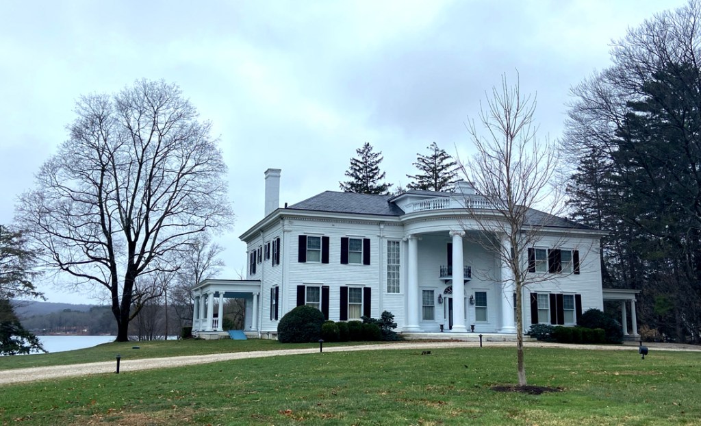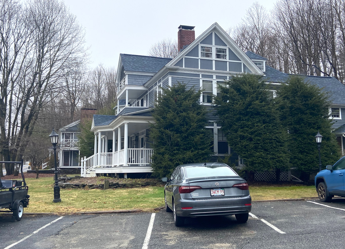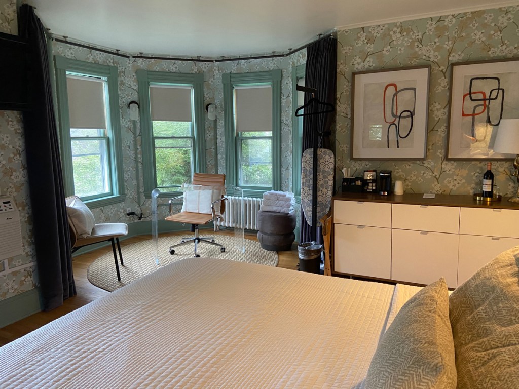 my goal for lodging was The Cornell Inn in Lenox (think Tanglewood). Not sure if off season pricing, but my two nights cost about the cost of one night down the road at the RLI, and I was very pleased. Snacks and drinks upon arrival, bottle of wine in the room, and breakfast. Not to mention close to town. Below the inn and then the common area room and my room, the Writer’s Retreat with lots of space. My room was in the main house, but there are rooms in the building beyond in the image below, and in the Carriage House — lots of choices for me in additional visits.