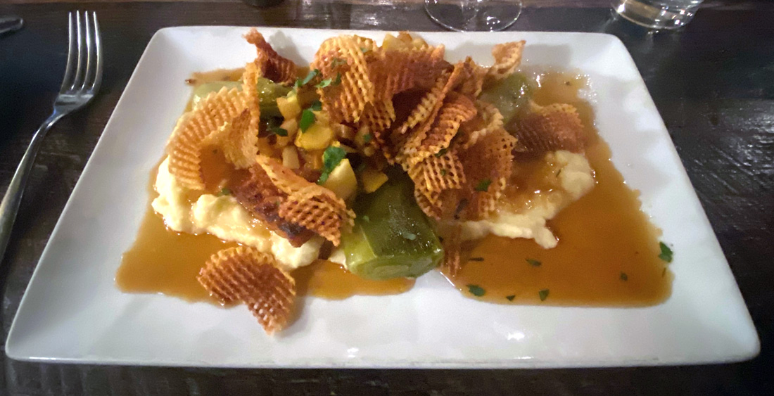 BUT, the next night I went a few doors down to ALTA at 34 Church Street. Maybe now my “go to” restaurant in Lenox. Below the gallery below at ZINC you will see my salmon at ALTA Restaurant & Wine Bar with the amazing presentation and tastes, as described on the menu – Apple Cider, Maple & Delicata Squash Sauce, Mashed Potatoes, Poached Leeks, Waffle Chips. WOW