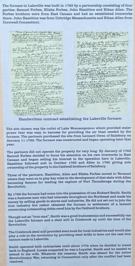 When I do a two night adventure I have plans for the day in between – usually a “loop exploration.” I have my favorite routes and stops when in this area. I headed over to West Stockbridge, crossed the border to NY 22 and headed south on this favorite stretch of road to Millerton, NY. From Millerton I took US 44 east toward Connecticut passing first into Lakeville, CT (part of Salisbury) — but not having stopped in decades (if at all) I pulled in to read the below about the Revolutionary history in the area. I knew that Ethan Allen (think Green Mountain Boys) was instrumental in the development of the iron industry here. I have had for years many books on Allen, but just now found this great short read about his early time here — you may wish to spend a few minutes clicking this link that I just found.