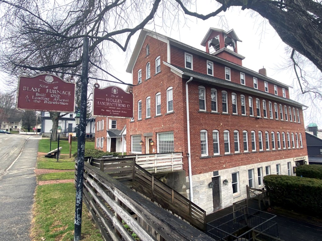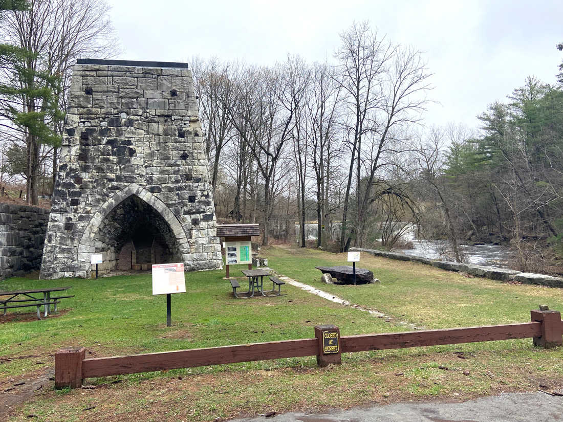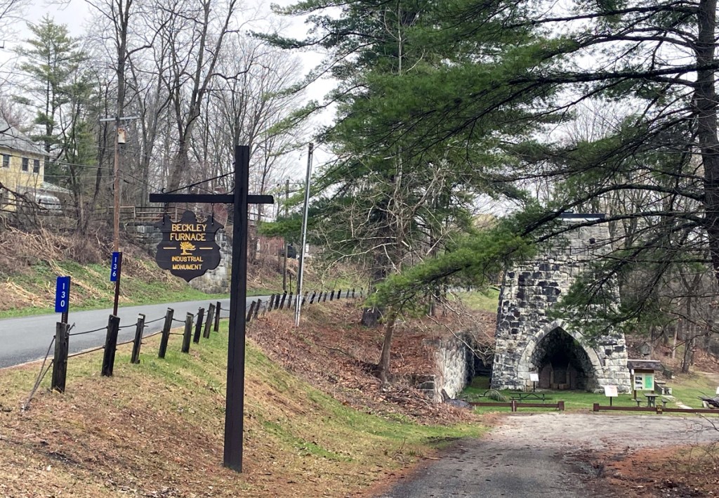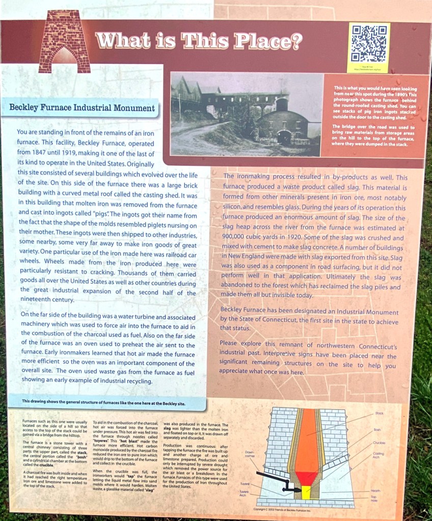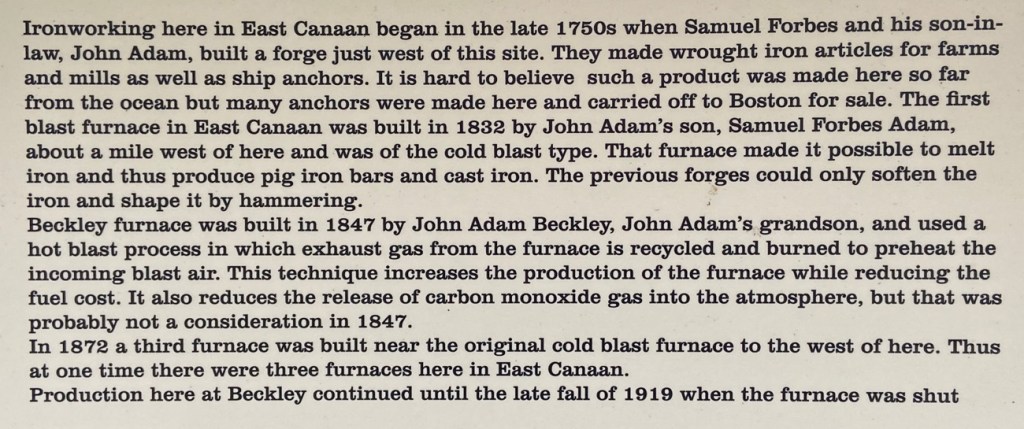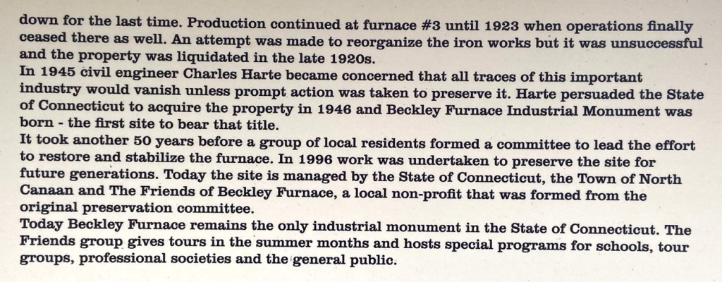 Continuing my “loop explorations” I continued on US 44 through Salisbury village, then took a back road over to Falls Village, CT, another favorite spot on my favorite US 7. Then north on 7 back to 44 and into Canaan. BUT WHAT IS THIS HISTORICAL MARKER? On US 7 I do not believe in all these years I saw BECKLEY FURNACE to the road on the right just before the intersection. But in “forgiving myself” for the oversight, even though the state had owned the property for over 50 years, development did not start until 1996 – so maybe the sign (which is on a bend in the road) may not have gone up until after I moved to NH. But, I did pass often as I had books in “the late” Whip Shop Antiques just over the border in Southfield Village.
