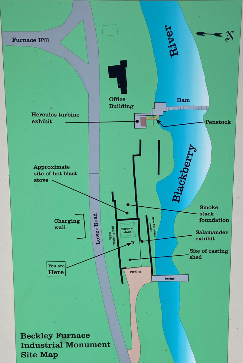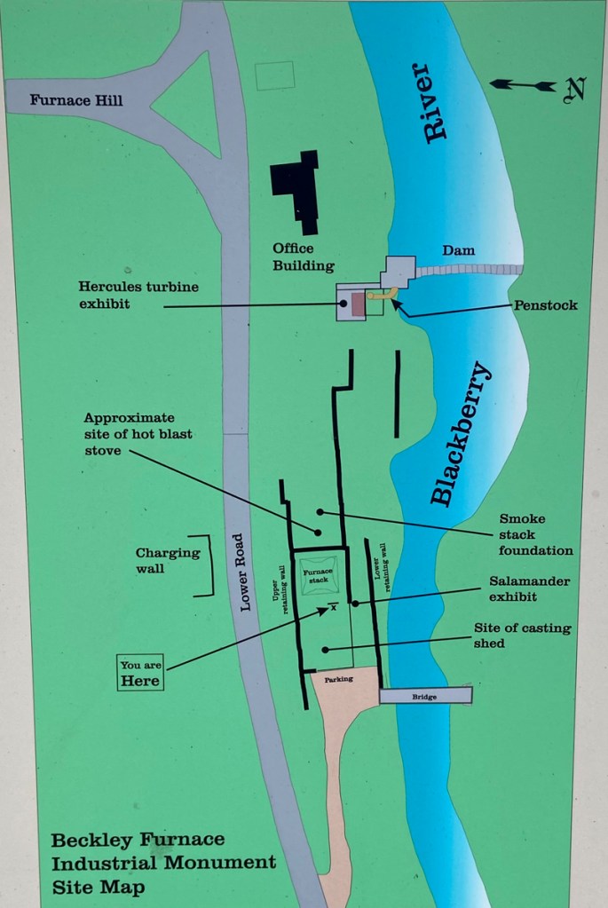 note the bridge lower left crossing the river – there is a newer bridge there now that I crossed. You can see the stones of the furnace smoke stack surrounded by the wood structures. This view is basically looking to the north.