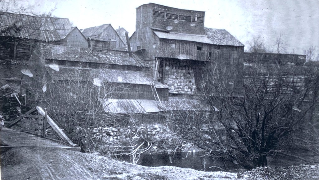 river to the right, dam in the background which provided water to a water wheel to assist the operations. In the foreground of the stack were buildings as you will see below in an old photo.
