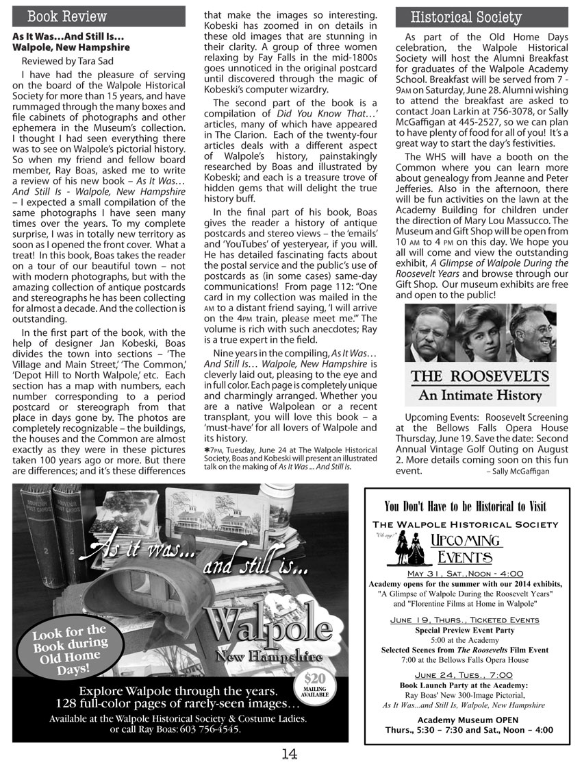 Ray Boas’ new 128 page book, AS IT WAS…AND STILL IS – WALPOLE, NEW HAMPSHIRE, tours the reader through more than 125 years of history shown through 300 rarely seen images creatively displayed, all in full-color. Based on Boas’ collection of postcards and stereoviews started over a decade ago, the book has been completed for publication in conjunction with Walpole’s 2014 Old Home Days celebration. The main section of the book divides the town into five sections each beginning with a map. The postcards and stereoviews, with historical captions, are keyed to the maps. Also included is a collection of historical articles written by Boas for THE WALPOLE CLARION, and a brief history of postcards further illustrated by Walpole postals.