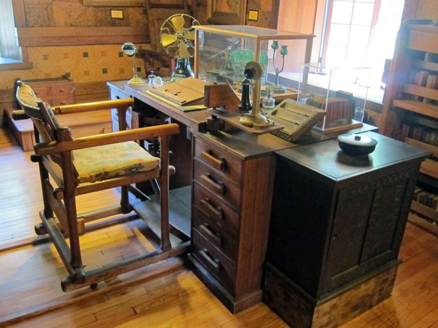 His desk with chair on rails for easy movement in and out