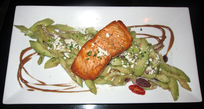Bantam Grill, Peterborough, NH — Here was a real pleasant shocker. Following a sleigh ride at the Silver Ranch in Jaffrey the last day of January, 2015, the group decided to have diner on the way home. Now, who would think great food would be in a little “strip mall?” We stopped at the Pearl Restaurant (which friends knew was good) only to find that they were booked for the evening. “Head over to our sister restaurant,” the hostess suggested. And, we walked three doors down to Bantam Grill. Fantastic specialty bourbon cocktail with mulled cider, and bacon infused with brown sugar. I enjoy French Onion Soup, but did not like theirs made with Gruyere Cheese. BUT, my Pan Roasted Salmon with Feta Cheese, English Cucumber Salad, Kalamata Olives and Balsamic Vinaigrette – WOW. Click on image below for a more mouth watering view.