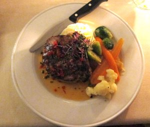 And I had, Pan Roasted Faroe Island Salmon, seared tomato and chard with a lemon-dill cucumber relish. Instead of rice I chose a special potato (sorry forget what it was called). The flavors, presentations were in my estimation ONE OF THE BEST MEALS I HAVE HAD in my travels.
