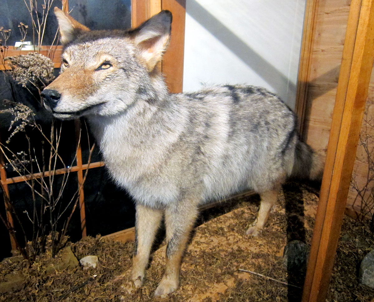 Coyote – most animals and birds mounted in cases, typical of time when done.