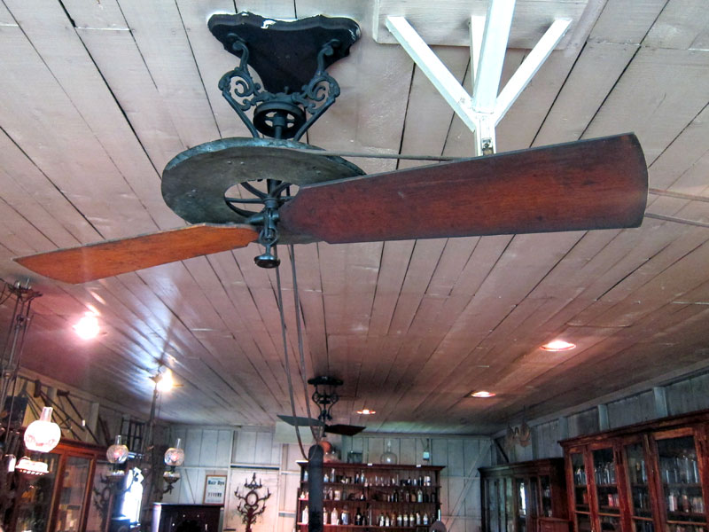 Note the belt comping from the water pump (originally driven by a water turbine in a stream) that drives the ceiling fans. FANTASTIC