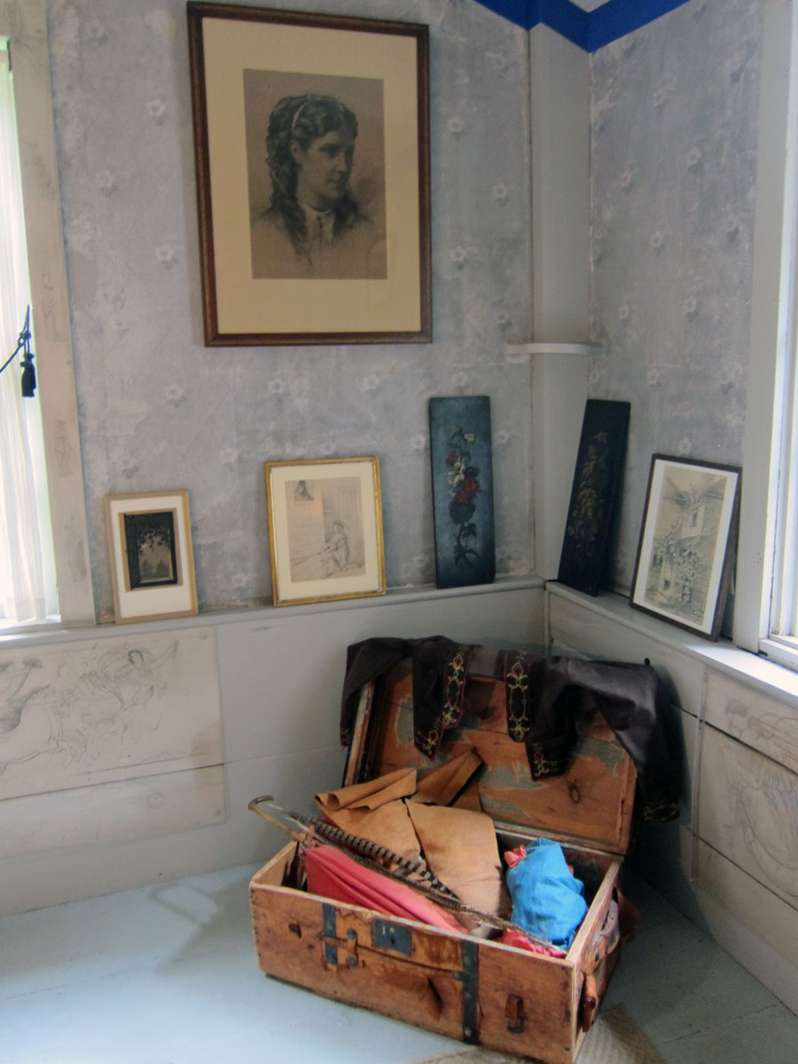 Trunk of costumes in May’s chamber, with back stairs to the parlor where they performed their theatricals.
