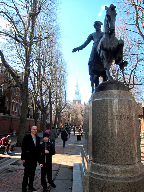 About 4PM we left, and walked along the harbor towards the North End. We cut through the Paul Revere Mall. Here are Gary and Alex with the statue.