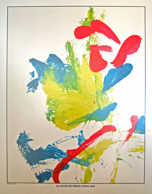 You know I like to share things you may not know about or have seen. Alex and Gary spotted a sign for artwork by the North Atlantic Fur Seals after we left their play area. Here is one of their pieces on display. The seals only see shades of gray, so their keepers help them select colors. The seals hold the brush, attached to a mouthpiece, and go to work. Original pieces were for sale in the gift shop for $70 – to benefit the seals.