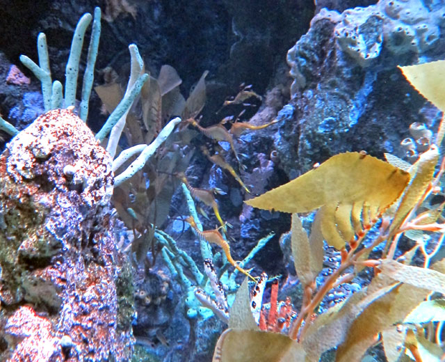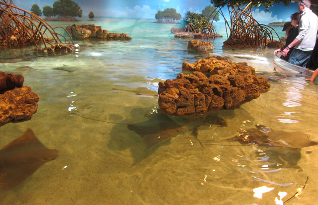 The interesting plants with roots extending down (Faux in the exhibits, but so well done) are Mangroves that have adapted for coastal shores. These extensive root systems filter out most of the salt out of the Mangroves’ needed water. What salt does get into the plant goes to the older leaves that then die and are shed. The root systems also provide protection from predators for many small fish, and safety for larger ones to mature in.