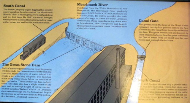 This cutaway below is fantastic telling all (and better display than what I saw the end of last year in the Manchester, NH museum). The canals are higher elevation than the river due to the dam. Water will flow through a turbine or waterwheel under the mills to drive the belts to drive the machinery before flowing back into the river.