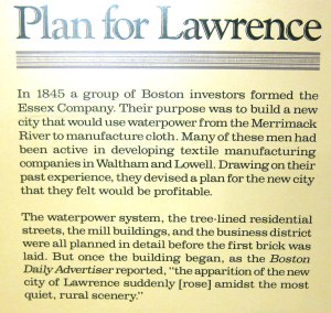 Remember it is raining, so no good outside images (but now I regret I did not take one of the front of the museum and the north canal). I have history panels in a gallery at the end that may be of interest to you. On the Merrimack River, Lawrence was built in open agricultural land taken from two other towns in 1845. The river was dammed and parallel canals dug to then power the mills (more later). The Merrimack River, which begins in the White Mountains, powers mills in Manchester and Nashua, NH, and then Lowell and Lawrence Massachusetts. We think of most rivers (Hudson, Connecticut, Mystic, Mississippi) flowing south, but the Merrimack turns back up northeast at Lowell, finally emptying into the Atlantic at Newburyport, Massachusetts.