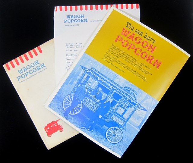 but up and coming. The City Market attracted visitors, and had open air booths in the lower level. Throughout the 19th century, the market provided a place for farms and plantations to sell beef and produce. It was also a local gathering place. Ray thought, “why don’t I buy a reproduction Cretors wagon, and sell popcorn for a living at the market.” On November 3, 1970, WAGON POPCORN sent me all the information on their reproduction wagons. (click to enlarge my literature images)