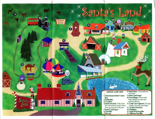 Over the past almost 20 years I have collected travel literature, maps, and brochures while on my adventures. I have them in labeled boxes so I can refer back to them to relive an old adventure, and plan new ones. The key is to occasionally go through to review what is there and make discoveries. On September 3, 2017, I made just such a discovery finding in the bottom of a box the rack cards for SANTA’S LAND from 2005, 2006 and 2007. So, here they are (on the maps, you can open up a gallery view, and then enlarge on your computer to full size) — ENJOY.